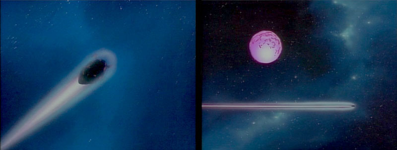 Suddenly, sound breaks the stillness of outer space. A point of light appears and quickly expands as it approaches. Its body is shaped like a huge missile and flies at the tremendous speed of light.