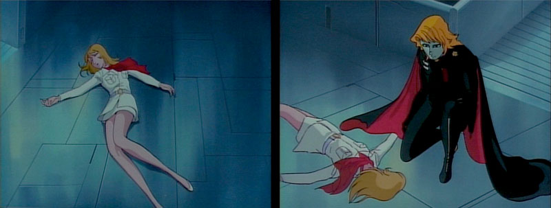 Her head drops as she faints. The craft rises and flies away through the gunfire of android soldiers. One humanoid officer approaches Yuki. He is young and strikingly handsome. This is Black Fleet Special Ops Lieutenant Commander Kiman. He has a Dessler-like nobility. Kiman’s heart is moved as he stares at Yuki’s beautiful face.