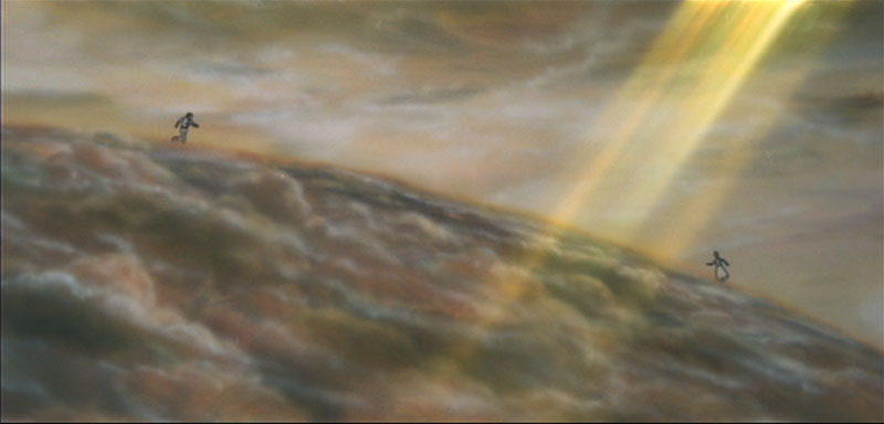 Yamato escapes from the dark cloud. (Here, the screen changes from Vistavision to Cinescope.) Relief quickly turns to surprise–the space outside looks exactly like the solar system.
