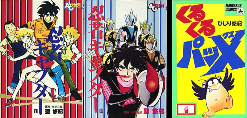 I worked on Ninja Captor for Producer Toru Hirayama. I did costume design, the hero’s vehicle, and enemy designs. I took them over to Toei Studio every week. That was in 1976, and I also did the serialized manga. [Two volumes of the Ninja Captor manga are shown below left. The first volume of Kuru Kuru PaX is below right.]