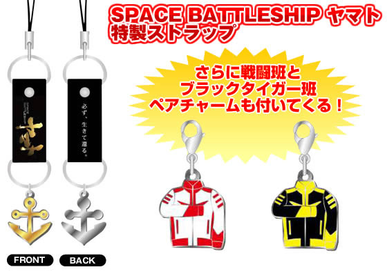 Three of those premiums are shown at right, all of which were announced by production company TBS (Tokyo Broadcasting System); a cel phone strap with anchor emblem (mysteriously using the anime-style anchor rather than the movie version) and two clip-on charms of crew uniforms in salute poses. To date, there is no evidence that these trinkets were actually made; they may in fact have been preliminary designs for the items that eventually did get bundled with one of the sets. If this is the case, then they went through some evolution after this image was published online.