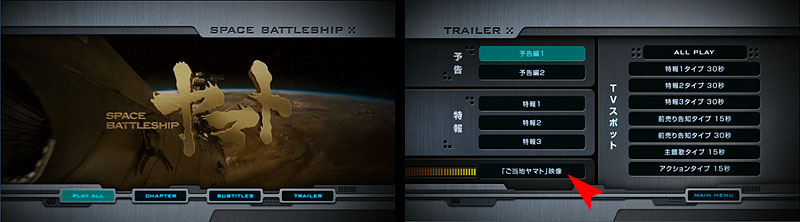 Shown here are the main menu and the trailer menu. The left column is for theatrical teasers and trailers; the right column is for TV commercials. The entry indicated by the red arrow is something a little more unique…