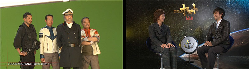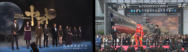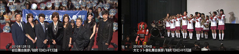 The last two featurettes (totaling 26 minutes) follow the cast and director from opening day well into December as they appear on stage at various theaters in different cities, answer questions, and participate in special presentations. Opening day at the Toho Cinema in Ginza is shown above left. Members of the Yamatour 2010 Adventure Team saw the film in that very theater two days later. Above right, Analyzer joins a brass band to welcome the stars to another Toho Cinema on December 4.