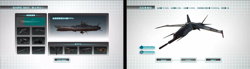 Clicking on “More Info” zooms us in for a closer look and some text. “360Ëš Move” is just that; an animated rotation. The complete collection consists of Yamato, Black Tiger, Cosmo Zero, Cargo ship, Land rover, Yukikaze, Okita’s Battleship, and four Gamilas vessels.