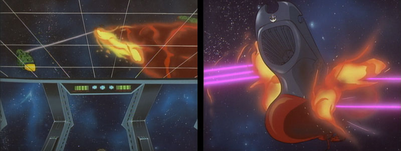 Taking several hits, Sandor urges Wildstar to fight back. (In both versions of the script, Japanese and English, he says something about not being able to do anything so close to Planet 11. Um, why? Derek seems to ignore this comment anyway.) The Cosmo Tigers are ordered to attack, the main guns open up, and both actions take their toll on the enemy fleet, easily demolishing several Galman ships. Dagon laughs sadistically, delighted by the battle. Several of his forces break off to engage the Argo. Thus ends this episode, setting up for one of the most intense battles in Yamato III.