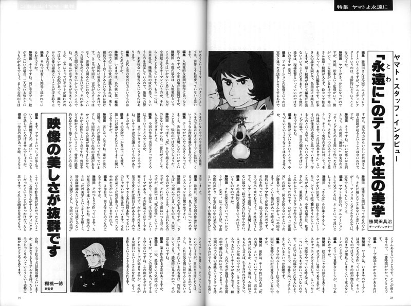 Katsumata: When Yamato became an opportunity for me, Mr. Toshio Masuda and Leiji Matsumoto were already directors, so now there are three of us. Mr. Masuda is not involved with the animation, so he supervised the storyboard and will continue with the editing. In the case of Mr. Matsumoto, he worked on everything up to color appointment, but will not participate in the editing. So in my case, you could refer to me as the foreman. (Laughs)