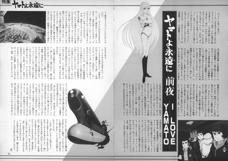 Imagine that there was no Yamato boom. Naturally, neither Galaxy Express 999 nor Toward the Terra would have been made afterward. In a case that is more familiar to myself, I doubt anime magazines would exist, either. In other words, Yamato has a huge presence. When one speaks of “the present state of anime,” Yamato is in the center of it as a matter of course. If not for Yamato, it would not have happened at all.