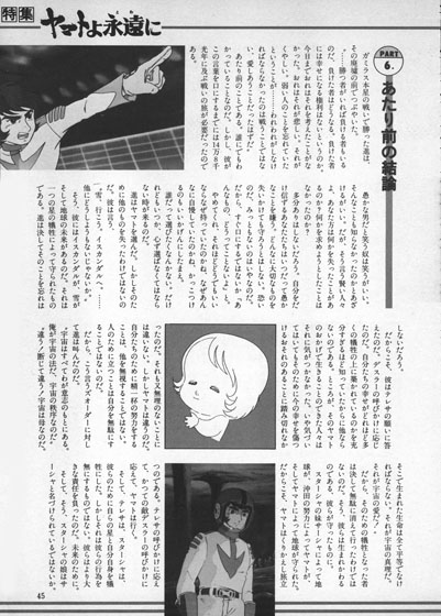 So for him there is Iscandar, Yuki, and the future of Earth. It was protected by the sacrifice of one planet. Kodai never forgot that. Therefore, he responded to the wish of Teresa [Yamato 2]. He responded to the call of Dessler [The New Voyage]. It was because he understood full well that one’s happiness is built on the sacrifices of others.