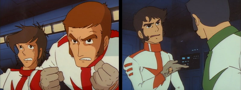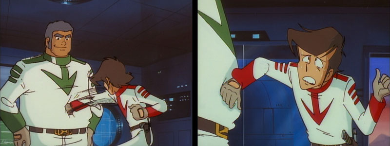 In Yamato III, they were definitely drinking alcohol (and too much of it, according to the bartender), but Star Blazers specifically claims their drinks were non-alcoholic (“space fruit sapper concentrate”). Nonetheless, Venture feels the pair is being dangerously negligent. Saki refuses to respect Venture’s authority because he’s the Navigation chief with no sway over the gunnery crew. (He must not have gotten the memo that Venture is an Executive Officer, which means he and Sandor share second-in-command under Wildstar.) Angered by their insubordination, Venture snatches their bottle away. When the gunners try to reclaim it they are grabbed by two powerful hands and flung halfway across the room.