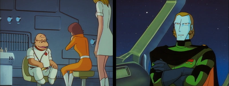In the next scene, an Alpha Centauri EDF Transport ship arrives to remove the dozen or so nurses, including head nurse Penny, who I can’t recall ever saying anything despite her constant presence at Dr. Sane’s side. The transport ship is captained by the same EDF officer who greeted the Star Force at the Alpha colony. This is another one of those moments where it’s implied that ships are surrounded by an atmospheric envelope, since people stand on the decks of both ships in normal clothing to say their goodbyes.