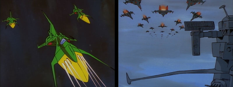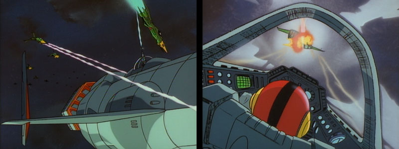 Story note: The green and yellow Galman fighters are new to the saga, an agile craft named the Seeadler III. Their appearance marks another contribution to the saga by mecha designer Yutaka Izubuchi.