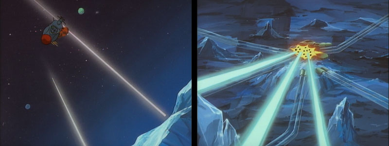 The immediate danger quelled, the Cosmo Hound searches the ground. Their efforts are soon rewarded when Wildstar spots the reflex energy beam in the distance. They head straight for the gun and Jetter takes it out with the ball turret. After a brief hurrah another beam flashes right in front of them, revealing a whole network of reflex guns. The presence of multiple reflex guns is as much a surprise to the viewer as it is to the Cosmo Hound team. (And also explains all those extra beams we saw at the end of the previous episode.)