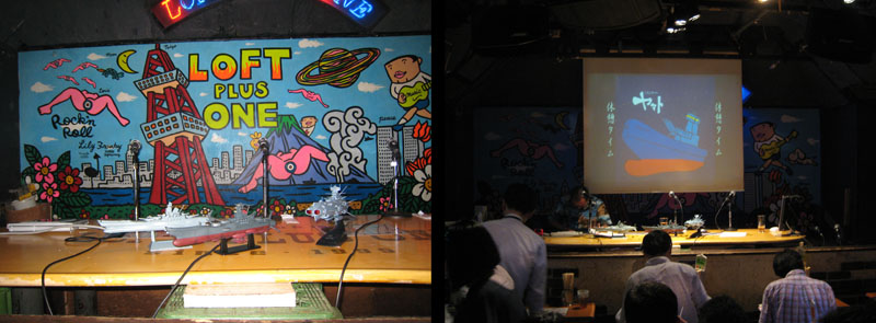 ‘Loft One’ has specialized in holding talk-shows for several years. Unfortunately, they have a stringent no-photography policy, so I couldn’t get pics of the hosts were on stage. Our host for the evening was Otaku Awards regular Ryoda Fujitsu, along with guests Ryusuke Hikawa (anime academic and freelance writer) and Shoji Harahachi (modeler). The talk lasted around four hours and was one big trip down memory lane for the Yamato faithful. A 10-minute slide show called Yamato for New Recruits introduced the series and movies. Harahachi then made a few comments about the first generation of Yamato models and how kits from the 70s still seemed better to him than the majority of kits from the 80s.