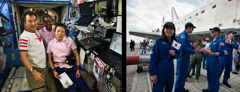 STS-131 marked some firsts and lasts; it was the last space shuttle flight for rookie astronauts, the last flight for a JAXA astronaut, and the first occasion in which two Japanese astronauts were in space simultaneously. As the photo above left will attest, they are both Yamato fans. That’s JAXA astronaut and ISS Expedition 23 flight engineer Soichi Noguchi at far left, a veteran of Discovery’s STS-114 mission (see him on YouTube here). He arrived at the ISS in December 2009 on Soyuz TMA-17, which means he missed the premiere of Yamato Resurrection. Where were his priorities???