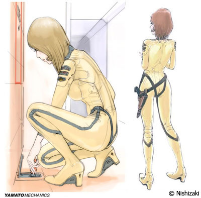About the methodology of Yamato Mechanics, the order was not very important during the modification procedure. It was iterative and incremental development. There were repeated changes of view for the visual, function and story [background] to draw an illustration. The ideas contained in a scenario supported the illustrations. To be exact, the deliverables of a Yamato Mechanics illustration could not exist without the caption text. So the work was to consider the way rather than simply to draw.