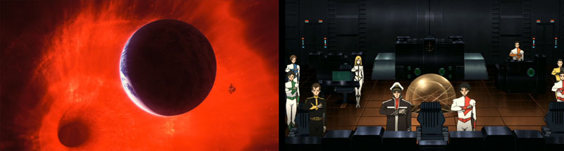 From the point of Kodai’s soliloquy, the mood becomes very somber. There is no Metsler, no talk of a singularity, and no pretense that there is a way to avert Earth’s fate. Yamato‘s crew stands in silent salute to their homeworld as the Cascade Black Hole closes the final distance.