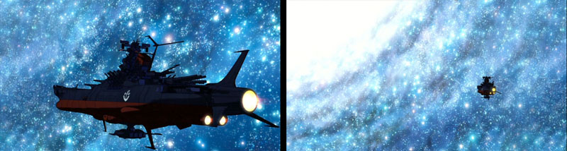 Space Battleship Yamato, undamaged, lumbers forward as the center of the galaxy spreads out in the distance ahead. We hear the voice of the narrator deliver the classic line about the vastness of space in which stars live and die in an endless cycle. And thus, space is alive.