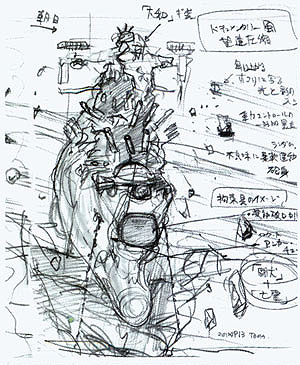Izubuchi: If a model has a lot of polygons in it, it looks dirty in a wide shot, with all the information densely concentrated. So after some discussion I decided that we would go that way [hand-drawing].
