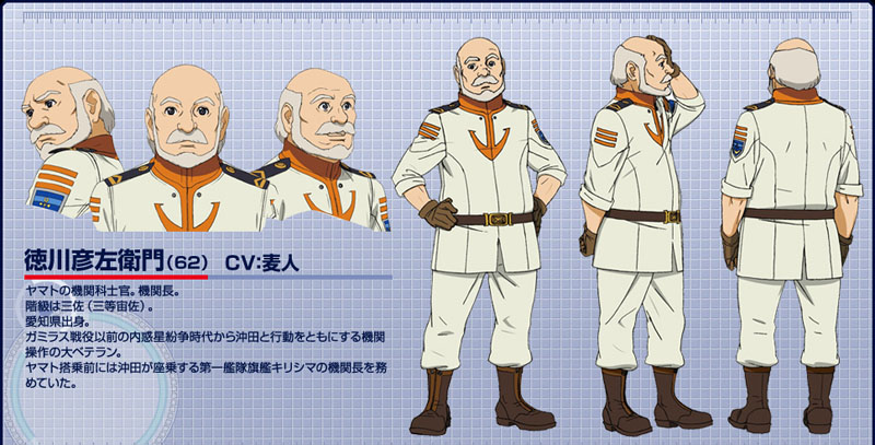 An experienced veteran of the engineering operation that supported Captain Okita in the previous inner-planetary conflict prior to the Gamilas war. Served as chief engineer under Okita on Kirishima, flagship of the 1st fleet, before boarding Yamato.