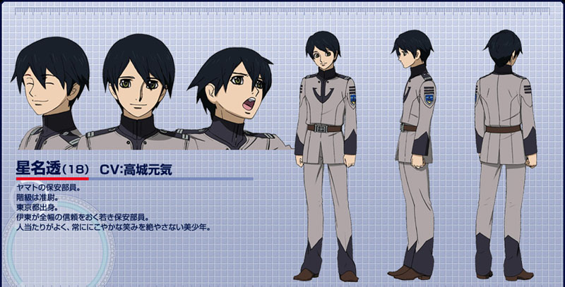 Was a third-class air captain assigned to the 7th strategic space group before boarding Yamato, but was advanced two classes and placed in command of the tactical division after his older brother Mamoru was killed in action. The main and secondary gun batteries, anti-aircraft guns, torpedoes, fighter wing, and wave-motion gun are all under his command. Deck officers are also placed under the tactical division. Graduated as an official cadet from space soldier training academy and was selected as a primary member of the Yamato Plan. (The forerunner of this was the Yayoi Plan, a top secret mission to escape Earth.)