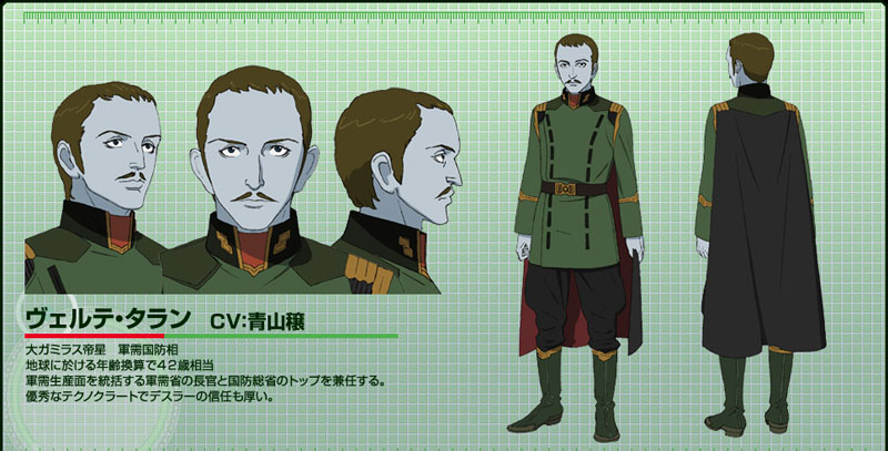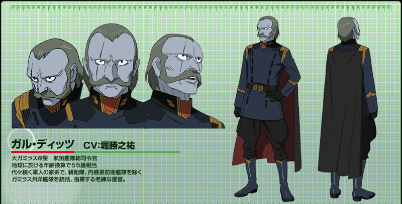 The vulgar Gamilas military commander from the original series (laughs at his own jokes). Minister of food resources, chief of the food production bureau. While attending a party function, he exhibits tasteless conduct while drunk and loses his life to Dessler’s imperial wrath.