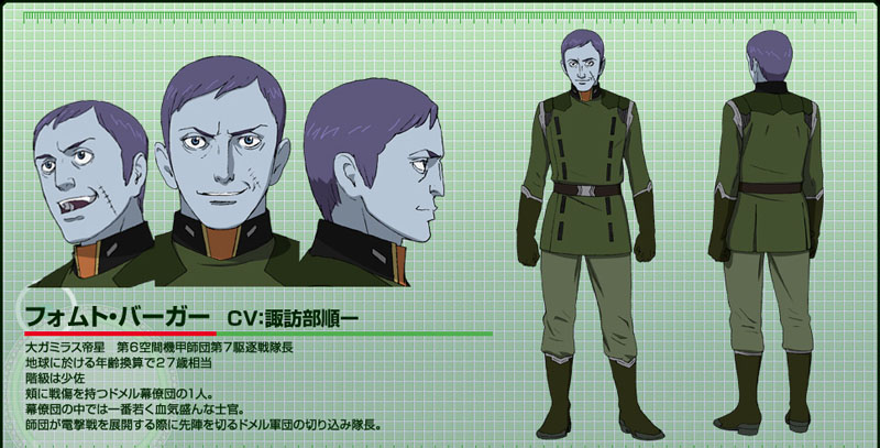 Worked his way up the military to a senior position. He is a self-made man who has accompanied General Domel into many battlefields. Holds the additional post of Captain of the flagship Domelus III while serving as a staff officer at the time of the open sea strategy. As a senior overseer of the staff, he experiences continuous friction with the reckless Major Berger.