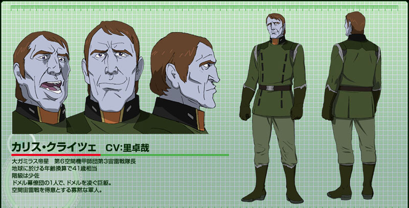 An intelligence officer of the royal guard who happens to be on board EX178 in Episode 10. His rank is Captain. He earned his place in the guard by being a first-class Gamilas citizen and looks down upon second-class subjects such as those running EX178. His arrogant attitude garners hatred from those around him.