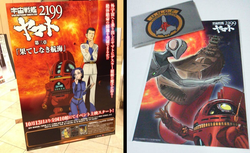 October 6 is the single most significant date in Yamato history; in 1974 it saw the premiere of the original anime series, and in 2199 it’s the day Yamato launches for Iscandar. Something is done to mark that anniversary almost every year, and this time it became the first day anyone could see 2199 Chapter 3. A sneak preview was held for Yamato Crew Premium members in Chuo, Tokyo one week before the official premiere. They didn’t have access to all the theater goods that would go on sale October 13, but they did get the new foil stickers (a new is made for each movie) and a special postcard featuring the cover art from Ship’s Log #1.