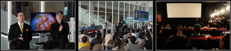 Machi Asobi translates to “City Play,” which is as good a name as any for a city-wide festival to promote anime and manga. It has been taking place in Tokushima twice a year since 2009, and Machi Asobi 7 had some special things in store for Yamato fans. 2199 Chapters 1 and 2 were screened back to back on both the 7th and 8th, with Director Yutaka Izubuchi on hand for a Yamatalk on the evening of the 7th. Since the 8th was the last day for the 5-meter Yamato display at Awa odori Airport, Izubuchi appeared there for a talkshow event with Tokushima prefectural governor Kamon Iizumi.