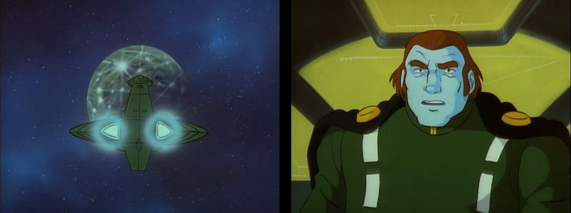 On Galman, Desslok is informed of Nayzmayo’s findings and is incensed. He orders the planet to be destroyed once the Argo has reached safety. Commander Gustav is sent out with a task force accompanied by a planet-destroyer missile. Gustav always reminded me of Dagon, probably because they share the same voice actor and hair-stylist. Seriously, J-curl sideburns must be all the rage on Galman. (Maybe that’s what “Galmania” means?)