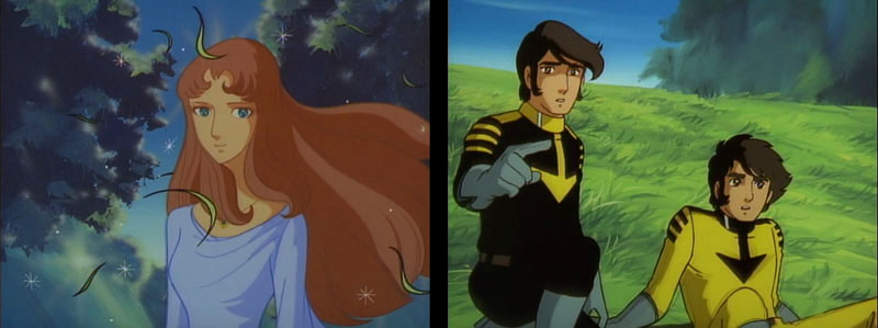IQ-9 arrives on Phantom, and while IQ, Beaver [Bando], and Sandor take off with him to do some science, Flash [Ageha] and Jason [Domon] are given time off to relax. They lie down in a field of grass, enjoying the feel of ground beneath them. Flash talks about the grass, the wind, and the mystery of the illusions while Jason drifts off to sleep. (Although Flash is the one speaking, it’s Jason’s voice that we hear in Star Blazers!)