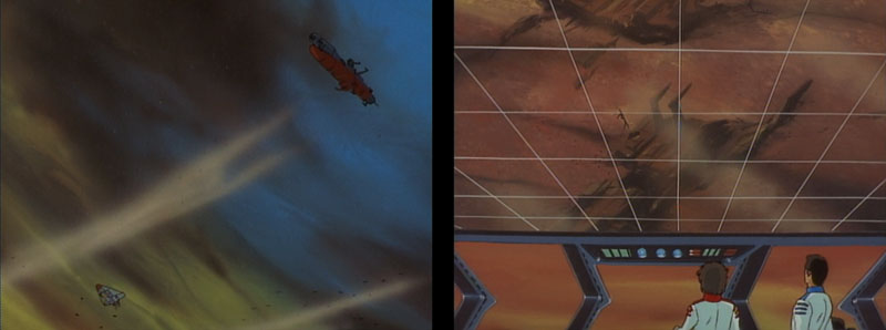 The survey crew lands near the wreck, which is identified as the American space battleship Arizona. (Look for a mistake in the cel layering as they approach the ship–IQ’s image is placed above a mound he’s supposed to be behind.) IQ scans for radiation and detects “Bolar 100” (or “Boradium 600” in the Star Blazers script), indicating the ship was attacked by the Bolar Federation. Nova says that the same energy signature was discovered when exploration ships from Europe and Africa were destroyed. Apparently, the Bolars have been very busy off-screen. We’ve seen American and European ships before, but this is the first and only reference to African ships.