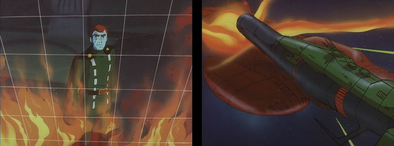 Yamato‘s fight with the Bolar advance fleet is pretty contradictory too. The Bolar ships seems to have high tech main guns with superior range, yet Yamato fights on after being hit many times, while the Bolar ships are clearly outclassed even if they fire beams and missiles by dozen. Gustav could have fired the proton missile against the enemy fleet instead of ramming it along with his ship (which could be destroyed before hitting the target). And why ramming one on one? His ships had perfectly good guns and were in position to make a flanking attack. The last dialogue between Kodai and Gustav is supposed to be dramatic, but instead sounds more like some Time Bokan script. Even Ageha worrying about Ruda’s safety by asking if she’s OK is funny. [End of note.]