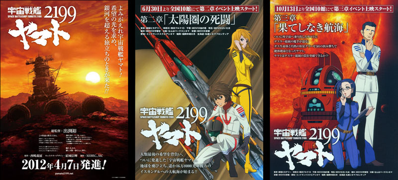 The premiere of each 2199 chapter in Japanese theaters kicked off a two-week run. Chapter 1: The Long Voyage on April 7, Chapter 2: Desperate Battle in the Heliosphere on June 30, and Chapter 3: The Endless Voyage on October 13. Limited-edition blu-rays were made for early sale with standard-edition versions released a few weeks later.