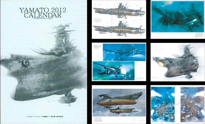Yamato calendars were a regular product back in the production years, then disappeared for a couple decades. They made a roaring comeback in late 2009 when three new ones were published for 2010. There were none for 2011, but things got back to normal when the Yamato Crew website announced this one (in the fall) for 2012 by mecha designer Makoto Kobayashi. Development art appeared on the site and those who placed pre-orders were offered a page for download on November 28 (shown below). The calendar contained the six pages shown above right and shipped on January 10.