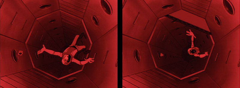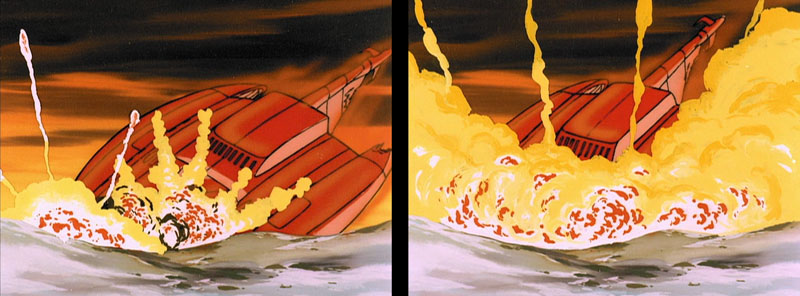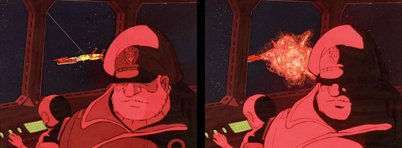 A companion vessel is hit and completely destroyed outside the bridge window of Okita’s battleship. The interior was illuminated by red emergency light by applying red paraffin to a cel that was painted in monochrome. However, the action outside the window is colored normally. The scene was first shot with a mask, then rewound and re-shot with the paraffin removed. This created the difference between interior lighting and exterior space.