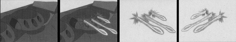 In other words, regarding effects, an element of “texture” acts as greatly as the movement of the drawing. A cel narrows down information only to an outline and a coating of paint. To express the changing of forms, which is the main point of animation, there are difficulties and limitations in using line drawings with respect to amorphous effects like “fire” and “water.”