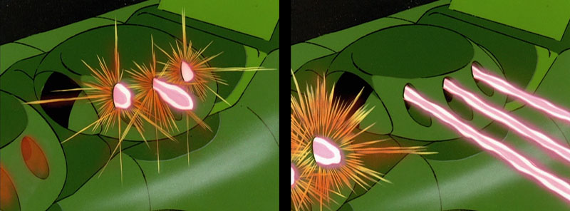 When all this processing of the light from the Gamilas ships is finished, it is arranged with a pink-colored core (the energy nucleus) that becomes white in its trajectory (overexposed to look white) with a structure of thin, high-energy flare (diffused light) around it. In order to express light, a convincing method is for the pink and white to ripple in the animation and give it a mysterious presence.