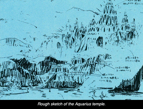 Nishizaki: I don’t want to give the Queen of Aquarius any weapons, since then it would stop being a utopia. Looking at it simply, there are several floating islands on the surface, and one of them is utopia. The power source to control the water would be at the heart. We could surround them with satellites if there are more than one. I think Mr. Toyota’s theory is that it’s a floating continent or something.