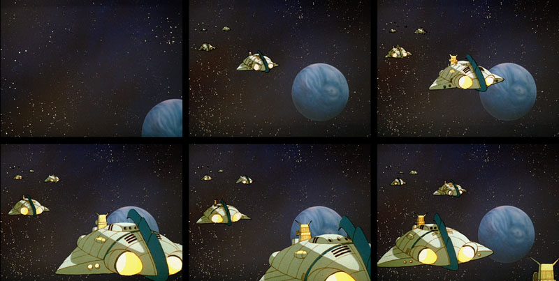 From Episode 1 of the 1974 Yamato. At first Pluto rises into frame as the camera descends, fully revealing the large battlefield in space. The Gamilas fleet appears as a point in the upper left and progresses rapidly into the foreground. Meanwhile, the background is continually receding. This is the power of optical compositing.