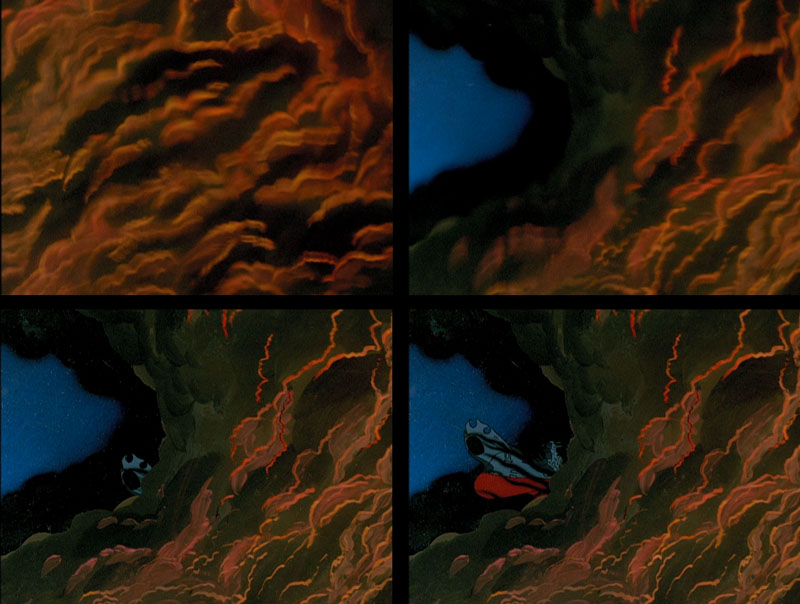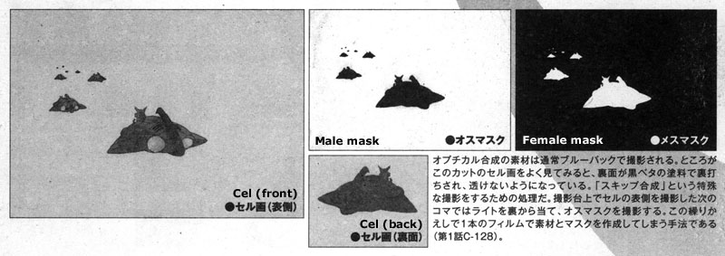 Materials for optical compositing are usually photographed against blue backing. However, when we look closely at the cels in this shot, the back is coated with black paint to make them opaque. This was done for a special process called “Skip Compositing.” After the front of the cel is shot, it is lit from behind and photographed in the next frame as a “male” mask. This technique of shooting, rewinding, and shooting again converts the filming materials into a mask.