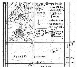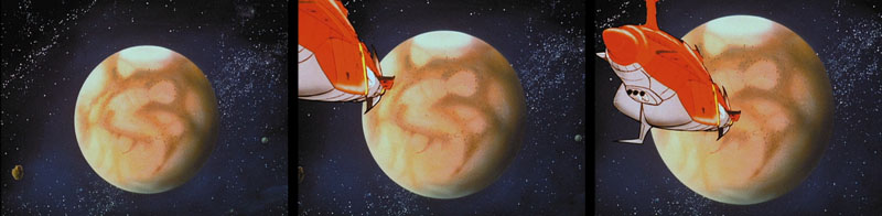 Okita’s ship approaches Mars to collect Kodai, Shima, and the capsule from Iscandar. The Mars background does a truck-up [gets larger in the frame], but Okita’s ship does a truck-back [gets smaller] to look like it’s closing in. The storyboard (at right) specifies “optical” for the production assistants.
