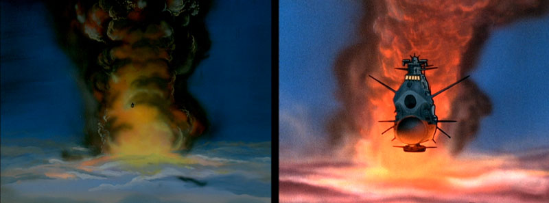 Above left: The smoke of the giant missile fills the screen. Yamato, which should be large, initially appears as only a tiny point in this ultra-long shot. The skill behind the effects production to make the most of such a size ratio later became evident in the feature film presentation.