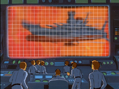 By the way, I notice that ripple glass was widely used for images in video monitors in early episodes of Yamato. As I introduced last time, the flickering enemy atmospherecraft carrier that appears on the large video panel during the interception battle in Episode 2 was done with ripple glass, and the shock cannon focus sight was used in conjunction with the art.