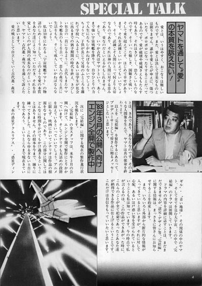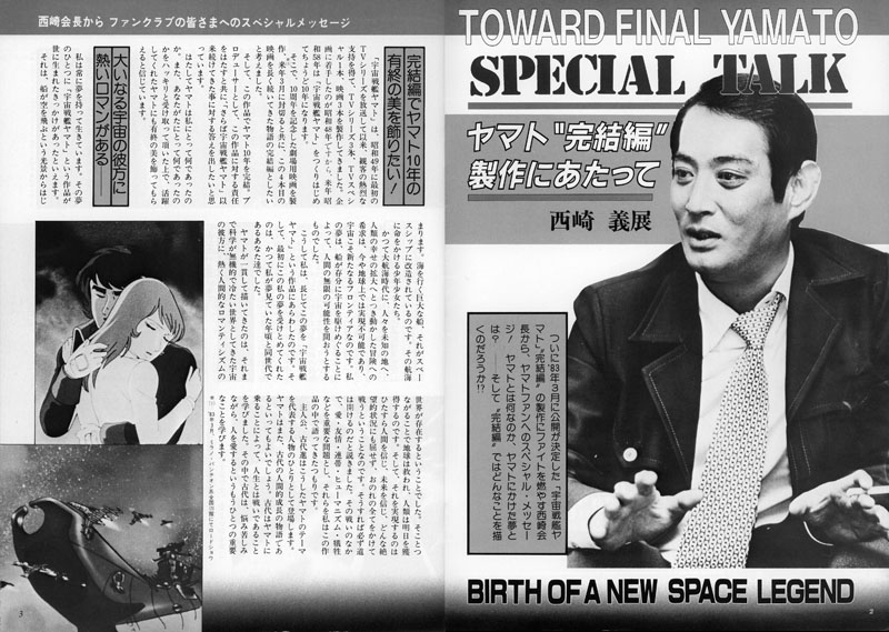 Since the first Space Battleship Yamato TV series was broadcast in 1974, the ardent support of the audience lead to three TV series, a TV special, and three movies. Because I started the plan in 1973, in 1983 it will be exactly ten years since I started making Yamato. Therefore, I am producing a feature film next March to be released in commemoration of the tenth anniversary, and I want this fourth movie to be the final chapter of a story that has been going on for a long time. (The film will open in March 1983 at 120 theaters in the Milano Pantheon chain.)