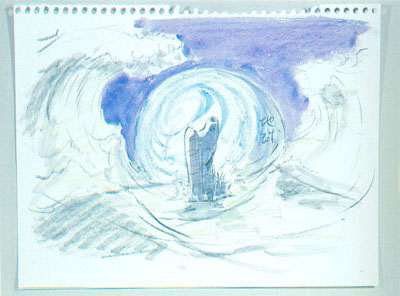 Makes a hole in the sea of Aquarius. It could be a beam. It will be like Moses parting the Red Sea. (sketch below left)