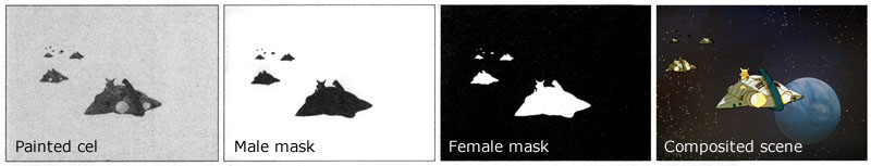 Revisiting last month: on the left is a cel painting of Gamilas ships, but in fact the back side is painted solid black. This is called “backing,” a technique to prevent transparency when light is shone through from behind the camera stand. This creates a male mask, from which a female mask is generated via laboratory processing. Finally, masking material is made for an optical printer.
