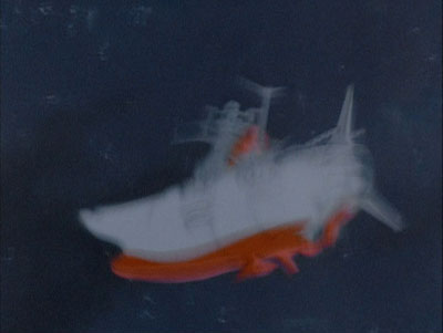 The second example of an optical composite, the scene of Okita’s battleship approaching Mars (with a truck-up on the background and a truck-back on the ship) was covered last issue.