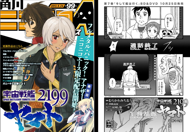 The online Nico Nico Ace manga magazine published this chapter of Michio Murakawa’s 2199 manga adaptation in its 99th issue, which recycled its cover image from an issue of the now-defunct Newtype Ace. The 24-page chapter continued the emotional storyline from Episode 7 of the crew saying goodbye to their families on Earth.