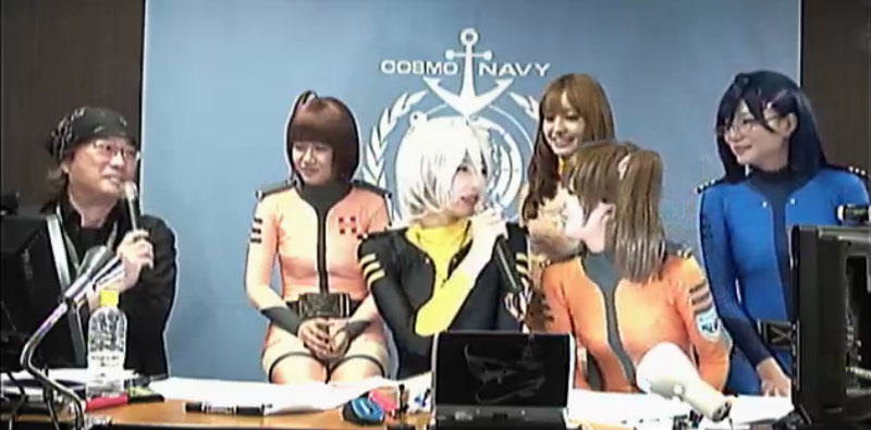 The Nico Nico simulcast was another extended affair, a four hour celebration called the “Big Sendoff Party.” Four of the Yamato Girls assembled once again, this time joined by race queen Noa Mizutani from Team Le Mans, and arguably the most special guest of all – series director Yutaka Izubuchi.